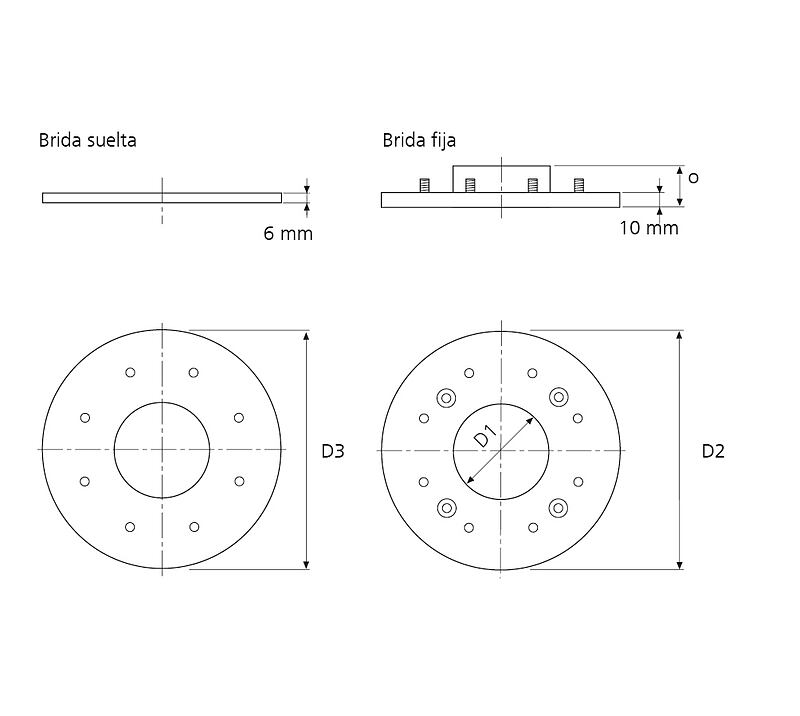 D1: Revestimiento de tubería Øi, D2: Brida fija Ø, D3: Brida suelta Ø