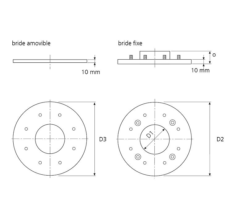 D1: Gaine Øi, D2: Bride fixe Ø, D3: Bride amovible Ø