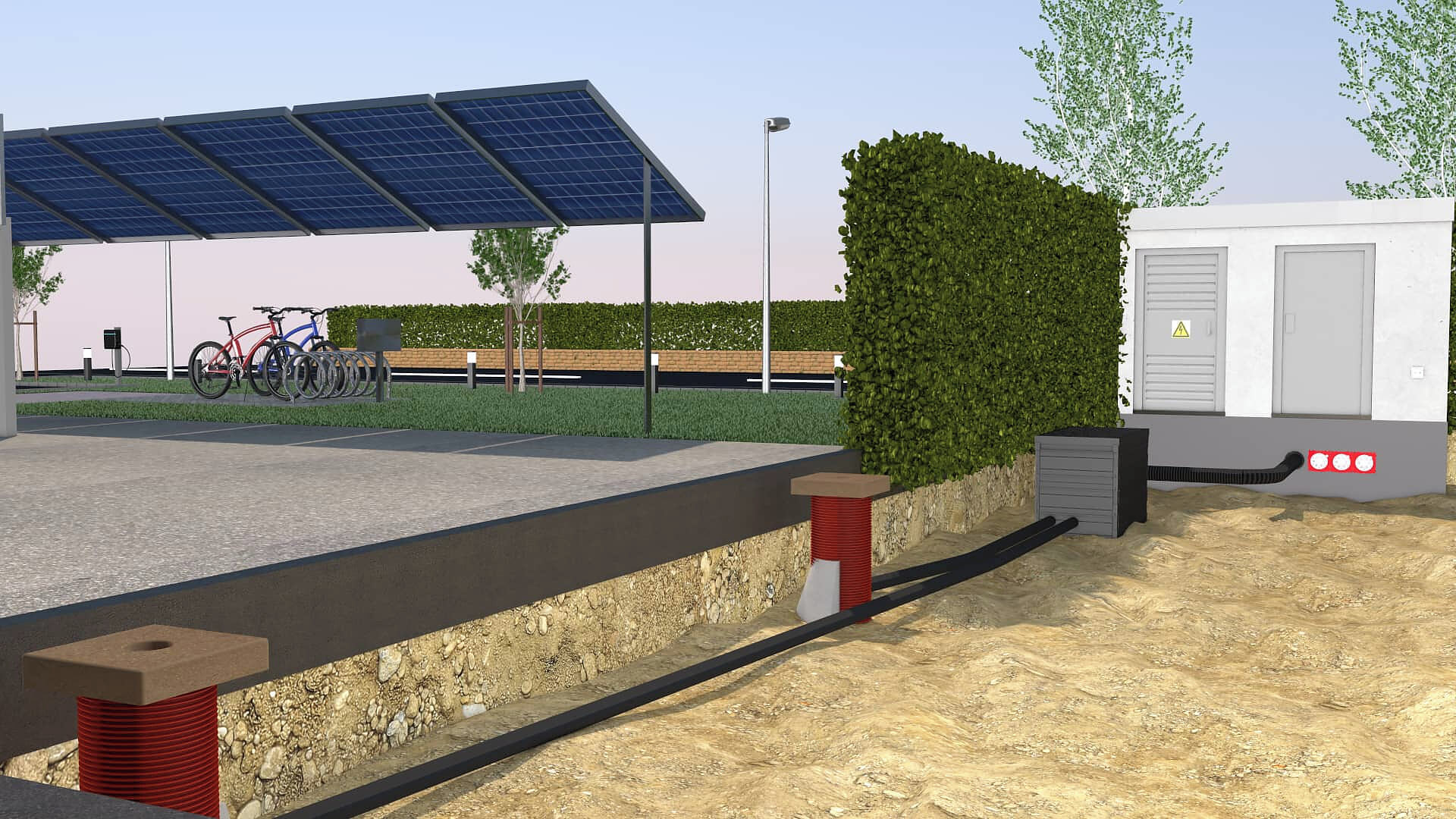 Universelle Fundamentlösung zur Installation von Ladesäulen und Ladestelen. Befestigungsmöglichkeit auf der Polymerbetonplatte. Anschluss von Strom- und Datenkabel über eine Leerrohrverbindung.
