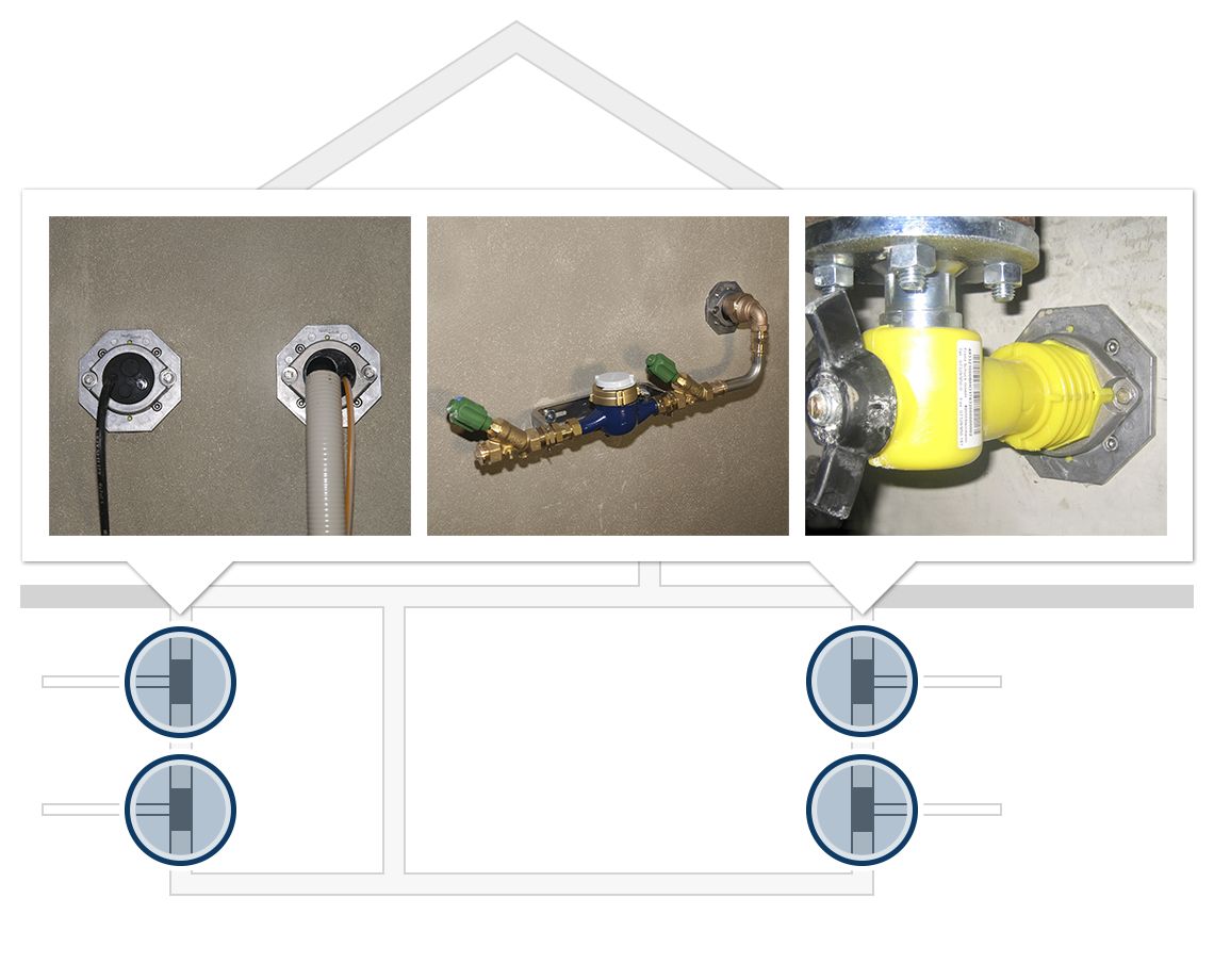 Gas- und wasserdichte Hauseinführung zum Einführen und Abdichten von Versorgungsleitungen (Strom, Wasser, Telekommunikation oder Gas).